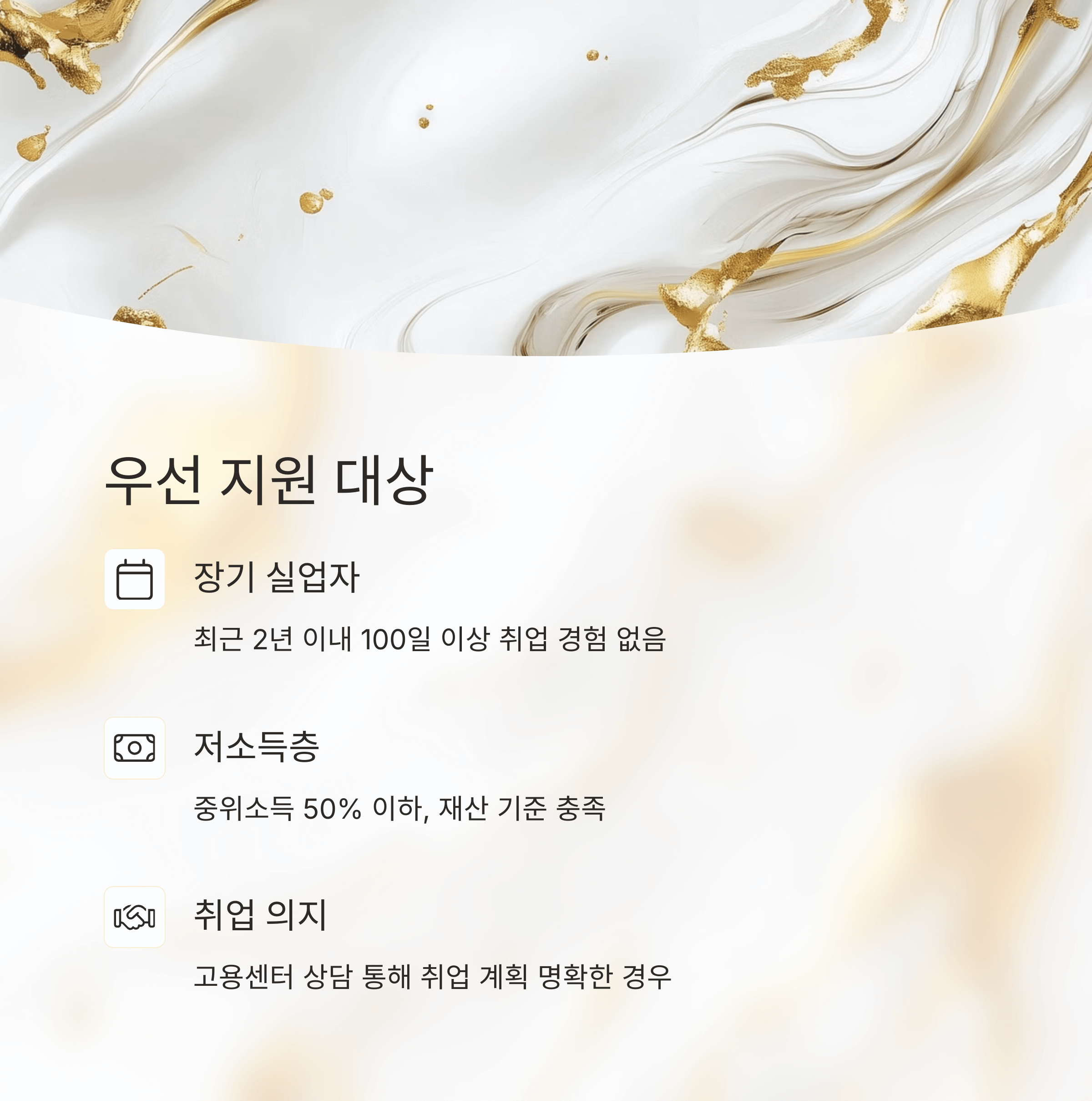또한, 최근 2년 이내에 100일 이상의 취업 경험이 없거나, 6개월 이상 장기 실업 상태인 경우 우선적으로 지원 대상이 됩니다.