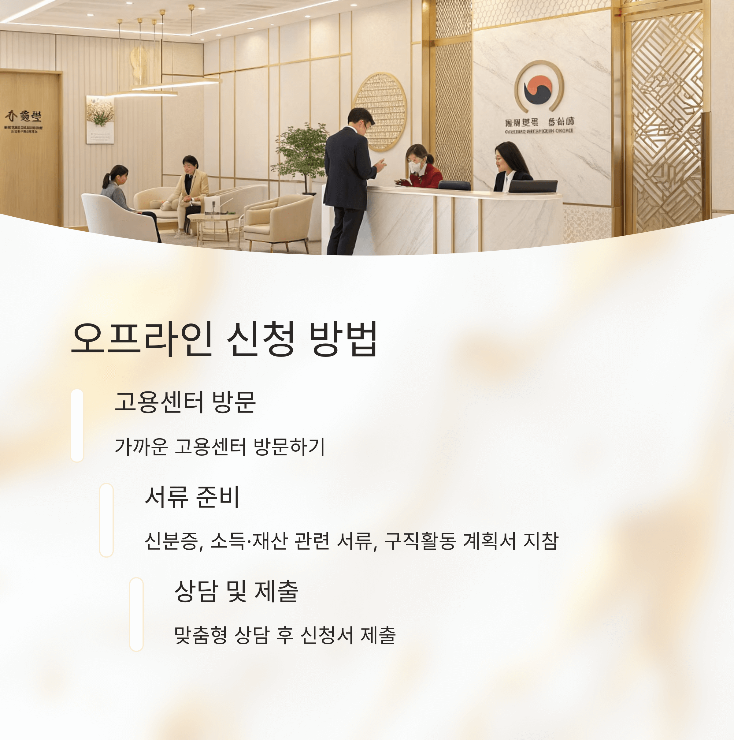 오프라인 신청을 원하는 경우, 가까운 고용센터를 방문하여 신청서를 작성하고 제출하면 됩니다. 이때, 신분증과 함께 소득 및 재산 관련 서류, 구직활동 계획서 등을 지참해야 합니다.